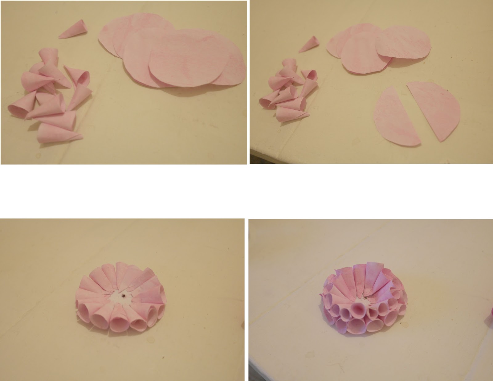 Вырежте из бумаги кружочки, затем разрезать круг пополам снова, и скатайте в маленькие конусы