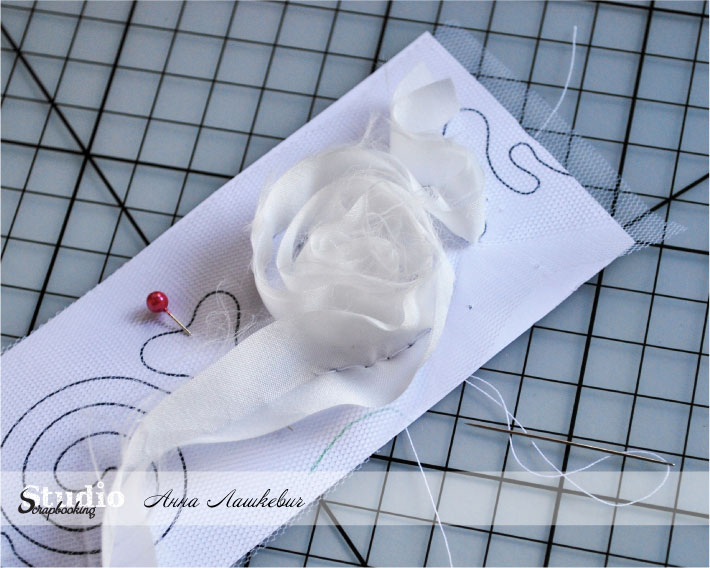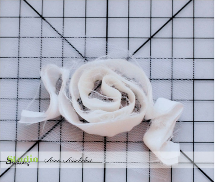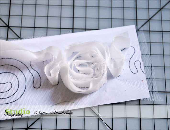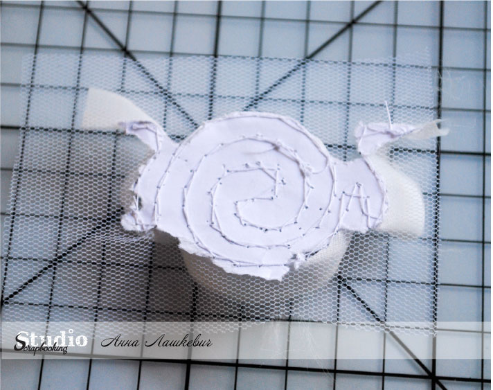 Первый этап готов. Прошиваем столько этапов, сколько необходимо и обрезаем фатин, ленту и бумагу.