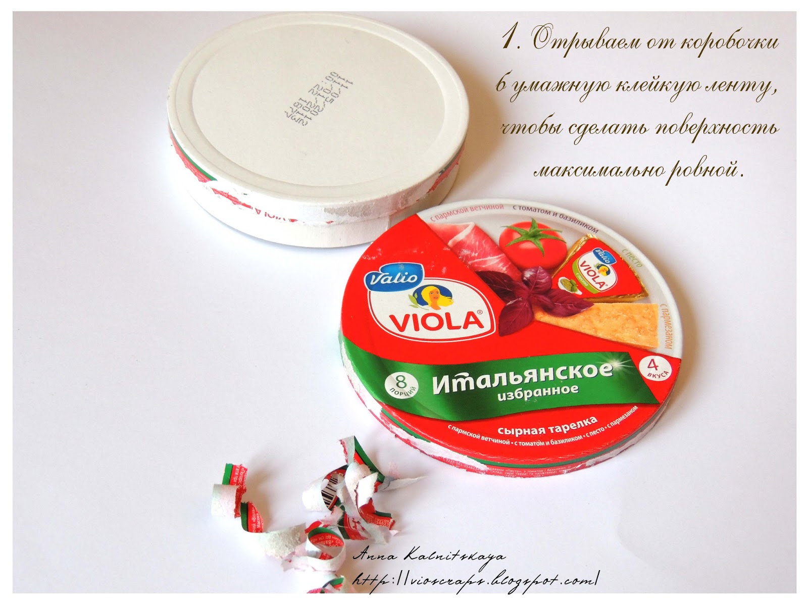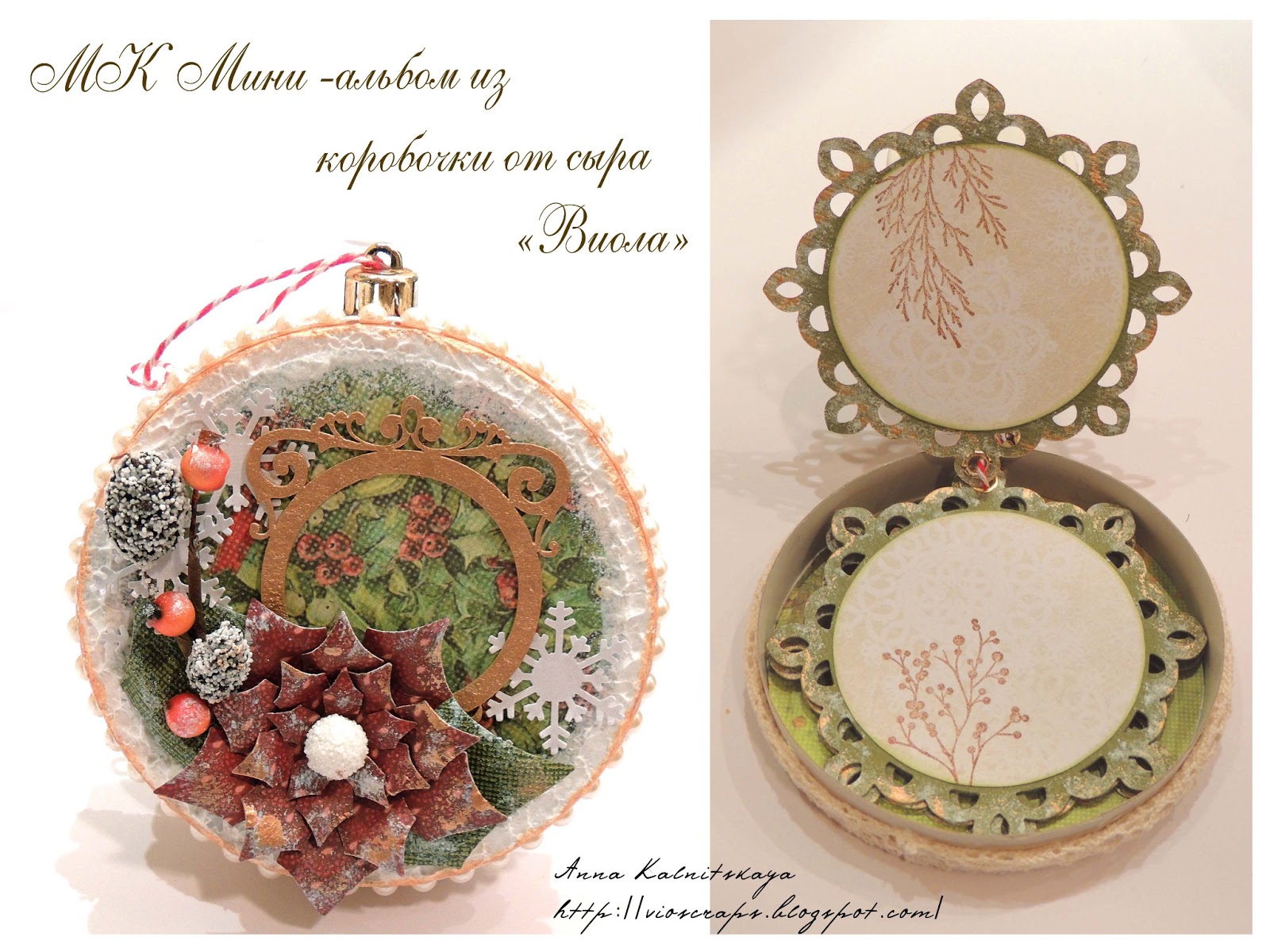В нашей семье все очень любят сыры! И, вот, милые круглые коробочки от плавленого сыра "Виола" уже давно не давали покоя моей фантазии =). Родилась очень простая по сути, но занятная идея сделать из этих коробочек мини-альбомчик в виде елочного шарика.
