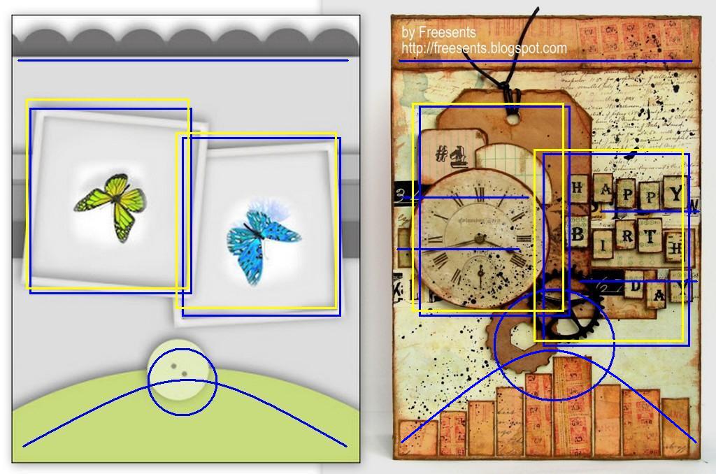 На примерах ниже я показала, как "прочитала" скетчи и сделала по ним открытки. Все основные элементы выделены синим, "ключевые" - продублированы желтым:
