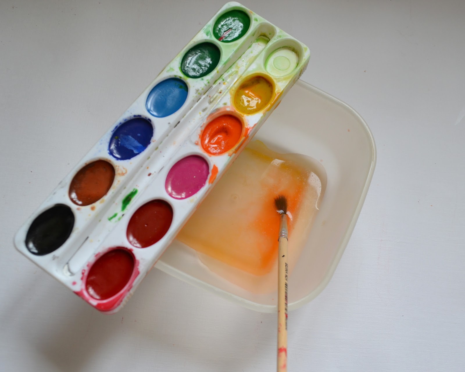 Берем акварельку и кисточку, и в любой ёмкости разводим краски до состояния нужной нам палитры