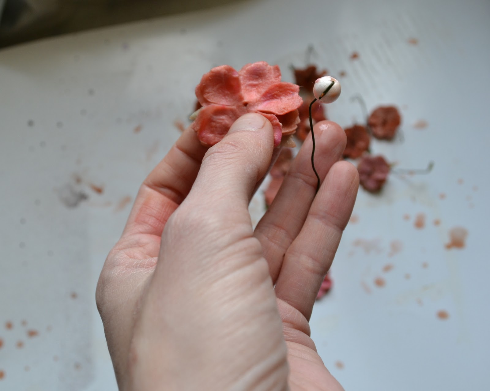 Видим, как когда то твердые, жесткие, с трудом поддающиеся разрезанию, разрыванию цветы стали совершенно послушными. Достаем из них серединки и проволочку