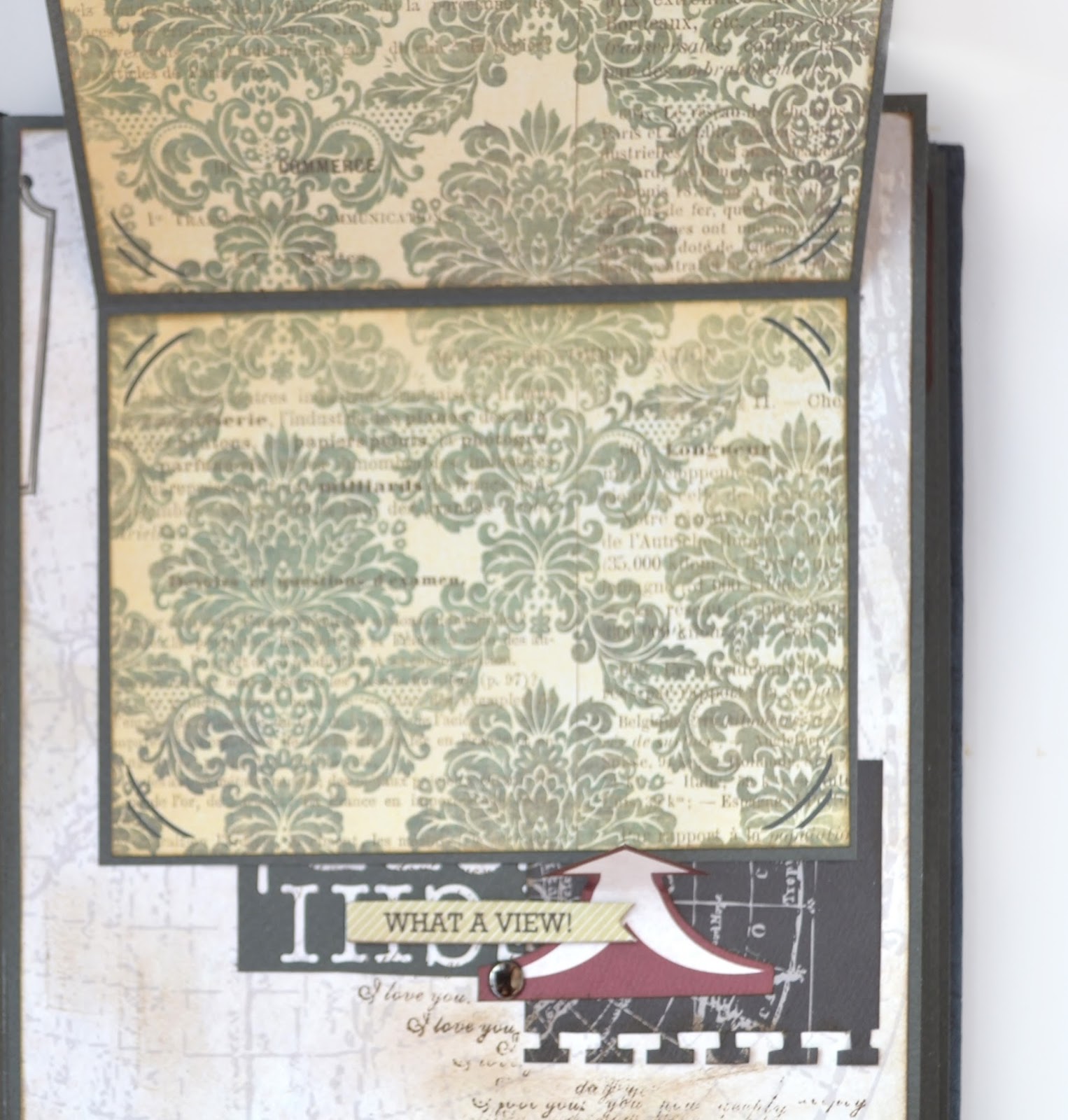 Второй разворот- на семь фотографий 10х15, пять из них справа в раскладушке-водопаде. В принципе, на внутренней стороне такой раскладушки можно тоже поместить фото.А на выдвигающемся элементе прячется журналинг.