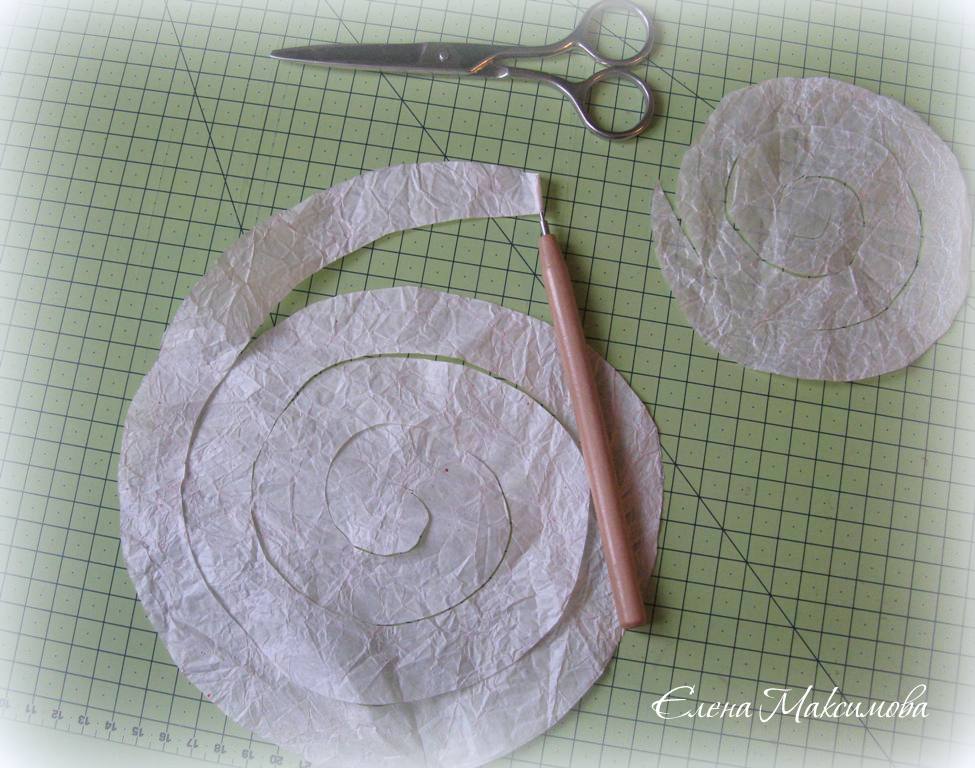Теперь от края полученного круга к центру вырезаем спираль (см фото). Я это делаю на глаз, чтобы на готовом цветке не было следов от карандаша. Ширина дорожки у большой розы – 2,5-3 см, а у малой - 1,5-2 см. От этого размера зависит высота полученного цветка.