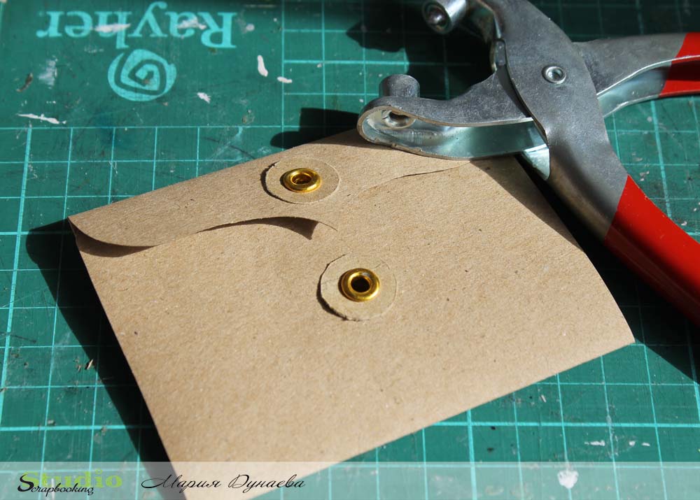 устанавливаем люверсы в дырки (желательно чтобы люверс был не сильно плотно установлен, те чтоб был люфт для наматывания веревочки) и склеиваем конверты