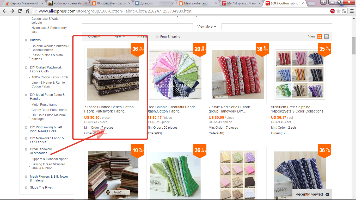 ВСЕГДА обращайте внимание на то, что указано в описании товара! Вот по наборам с тканями к примеру: видим цену 0,90$ и нужно понимать, что это ЗА ШТУКУ т.е. за один отрез, а в наборе всего СЕМЬ...