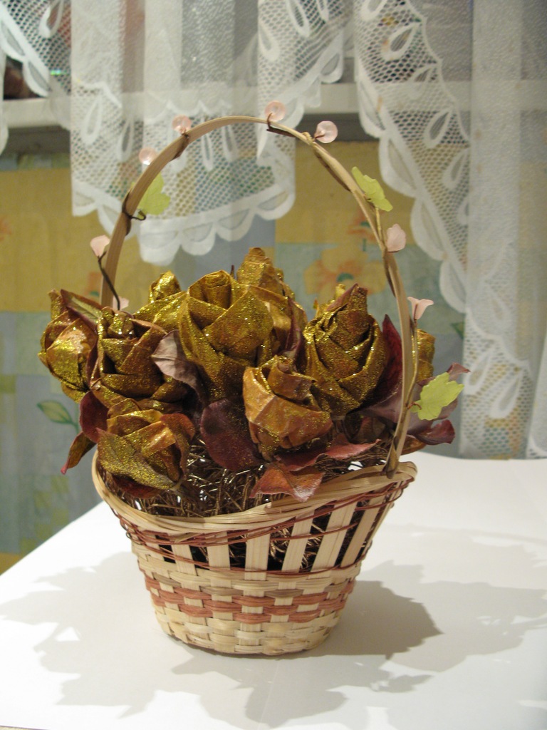 Очень красивый осенний букет получается из осенних листьев клена, из которых можно сделать искусственные розочки. Чтобы создать бутон розы, вам нужно взять лист клена, согнуть его поперек и свернуть в трубочку. Берем следующий листок. Прикладываем к скрученной только что нами трубочке из листочка так, чтобы трубочка была посередине. Затем складываем лист тоже поперек и заворачиваем в него нашу трубочку. Тоже самое проделываем со следующими листьями до тех пор, пока не создадите полноценный бутон. Основание нужно будет перетянуть ниткой. Возьмите корзину, в которую поместите наши розочки, постелите на дно кленовые листья и выложите бутоны. Только после этого зафиксируйте букет лаком для волос.