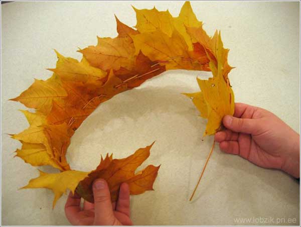Предложите ребенку сделать для него корону, а для вас кокошник! И представьте, что вы сказочные герои! В результате, интересное занятие может вылиться в не менее интересную игру. Возьмите проволоку и по размеру головы сделайте каркас. Его же можно сделать из бумаги, вырезав небольшую полоску и склеив ее начало и конец так, чтобы она плотно садилась на голову. И уже на этот каркас прикрепите подряд несколько желтых кленовых листьев. Посмотрите внимательно, у нас получилась золотая корона! По тому же принципу мы можем сделать и кокошник, только используя любые листья деревьев, плюс его можно украсить ягодами клюквы или рябины.