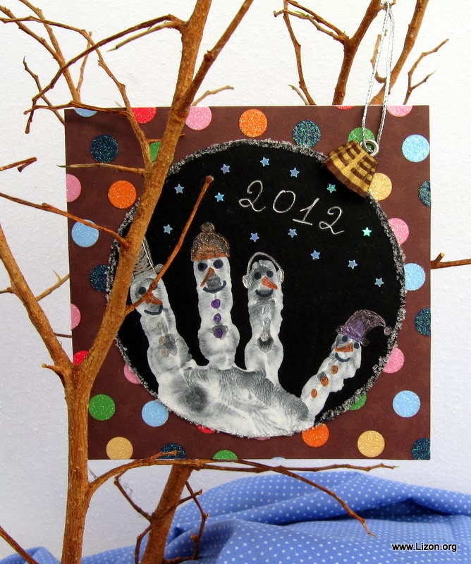 Здесь Том много работал. Наштамповали ладошку, приклеили колпачок (предварительно наставив краской точек с помощью ватных палочек), наклеили вату, нос и глазки. Я добавила только щечки и рот.
