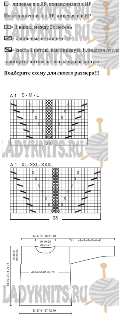 Как будет 66-68-70-72-74-76 см закрыть по центру 26-26-28-28-30-30пт для горловины и каждое плечо вязать отдельно. Закрыть 1пт у горловины в след.ряду = 18-21-23-27-30-35пт. Продолжить до 68-70-72-74-76-78 см (петли которые не входят в узор А1 вяжите лицев.гладью) и закрыть.
