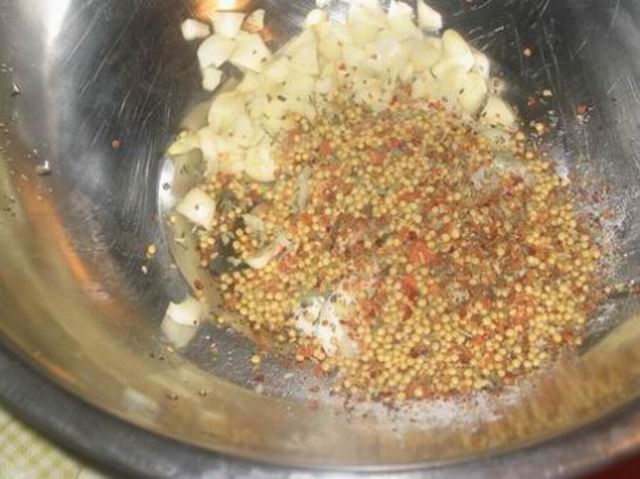 Сначала приготовим смесь для мяса: в майонез добавим нарезанный чеснок, приправу, соль по вкусу. Мне достаточно было кофейной ложечки.