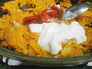 На этой же сковороде, подлив маслица, обжариваем луковицу, нашинкованную мелким кубиком. Через минуту добавляем натёртую тыкву.