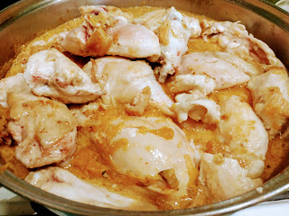 Тушим нашу тыквенную подливу минут пять. Затем опускаем в потушенную и чуть загустевшую подливку кусочки обжаренной курицы.