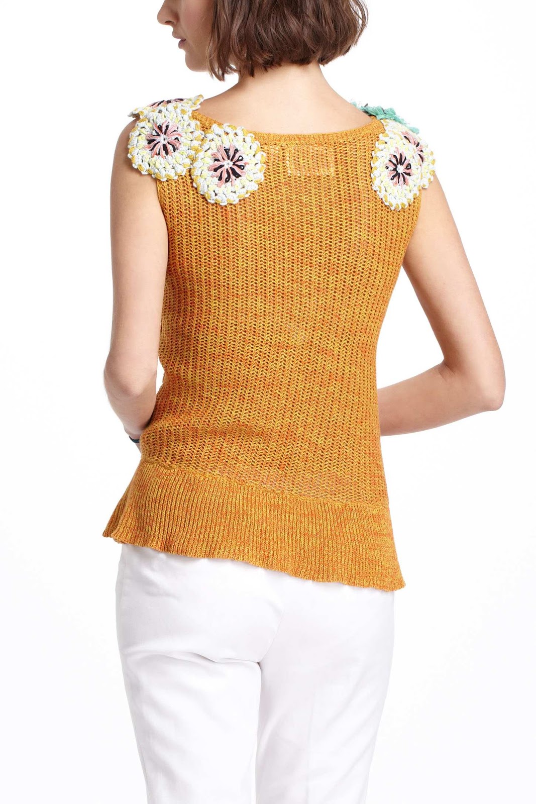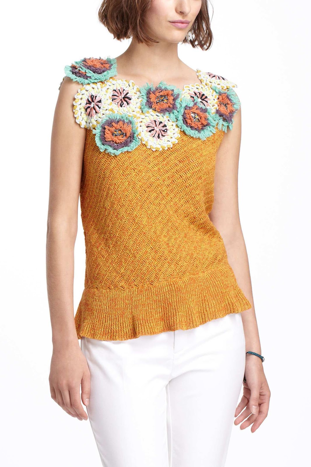 Satsuma Sweater Tank. Топик с разноцветными цветами вокруг горловины,связано крючком из хлопка и льна. Замечательная идея для отделки готового изделия!
