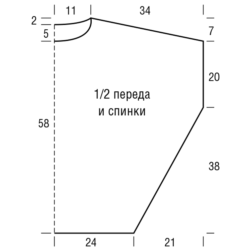 Через 58 см от начального ряда для плечевых скосов согласно выкройке в натуральную величину с обеих сторон убавить, равномерно распределив по высоте, 34 см.