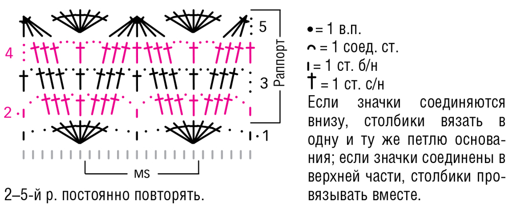 Вязать по схеме. Начать с петель перед раппортом, раппорт постоянно повторять и закончить петлями после раппорта, при этом ряды поворачивать, как указано на схеме. С 1-го по 5-й ряд выполнить 1 раз, затем постоянно повторять со 2-го по 5-й ряд.