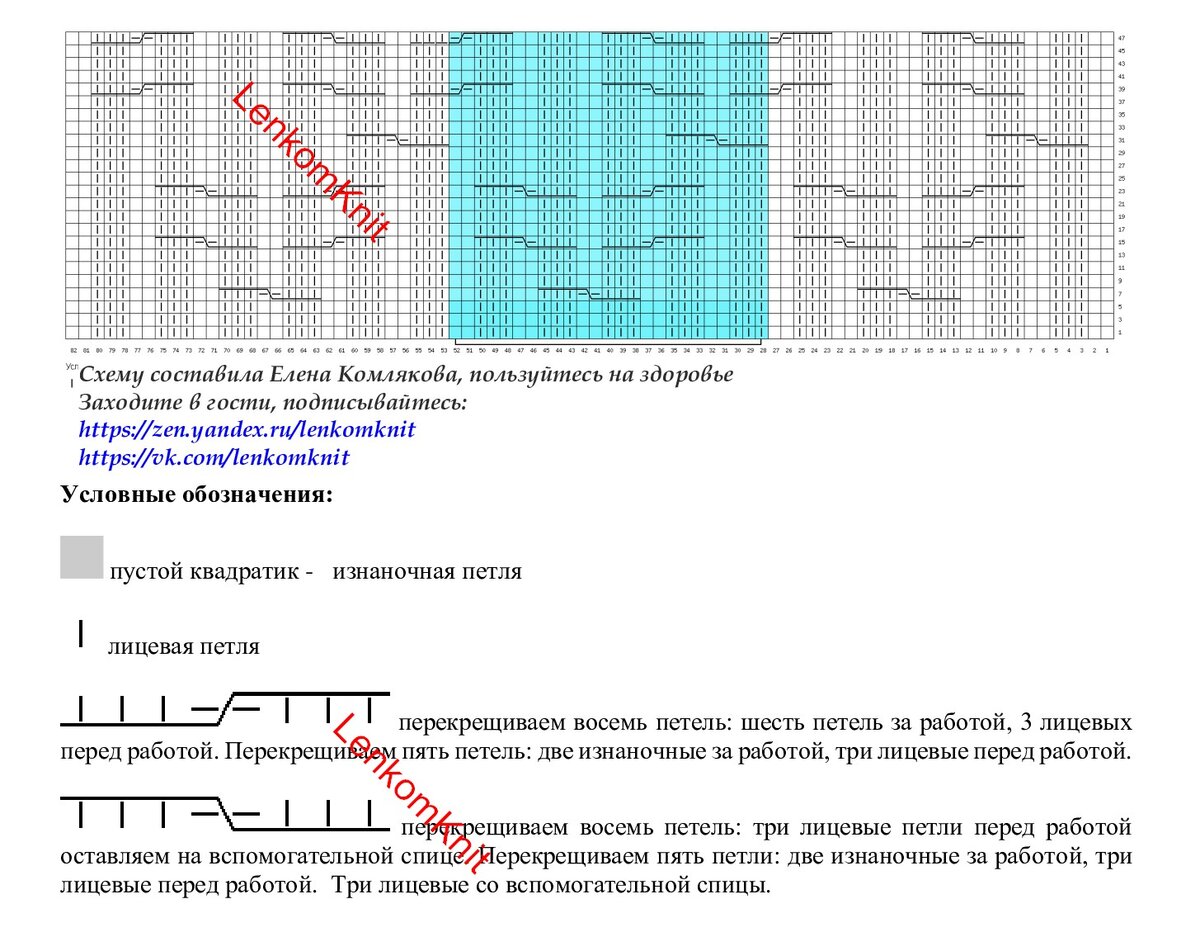 На рисунке - схема узора (только лицевые ряды, изнаночные вяжем так, как лежат петли). В высоту нарисован один раппорт (48 рядов). В ширину раппорт отмечен бирюзовым цветом - 25 петель. Начинаем вязание с 1 по 52 петли, затем повторяем раппорт нужное количество раз (петли с 28 по 52) и заканчиваем деталь петлями 53 по 82.