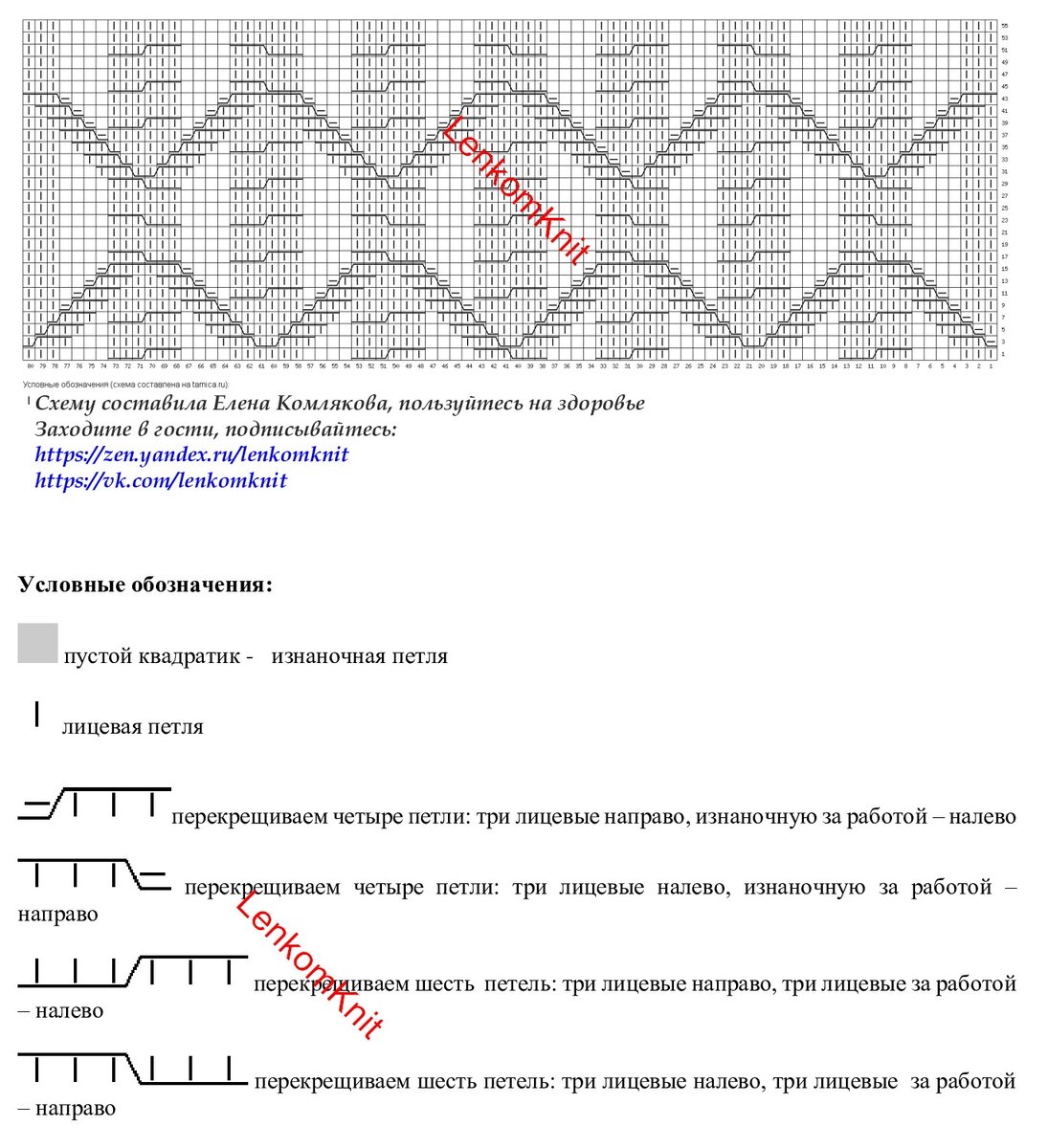 Как видно на схеме, весь узор построен на основе резинки 3х2 (три лицевых, две изнаночных). С одной стороны, вяжется он просто. Но этот узор требует большого внимания, чтобы все перекрещивать в правильном порядке. К сожалению, раппорт узора очень плохо виден даже на схеме без выделения цветом. А уж на спицах, особенно в самом начале вязания, его вообще не видно будет. Ошибку в таком узоре можно заметить очень поздно (например, уже в готовом изделии).
