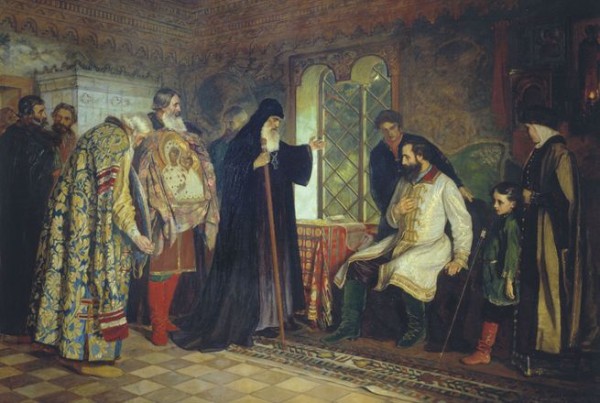 Хоть многие историки с этим и не согласятся, благодаря Александру Сергеевичу Пушкину все мы со школьных лет уверены, что Лжедмитрий – это именно Гришка Отрепьев, беглый монах из Чудова монастыря. На картине как раз сцена из «Бориса Годунова», в которой Отрепьева пытаются арестовать.