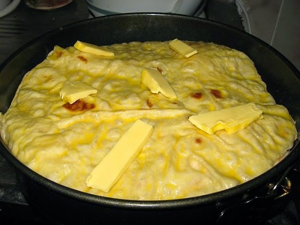 Смажем наш пирог сверху оставшимся кефиром...и положите несколько пластиков сливочного масла.