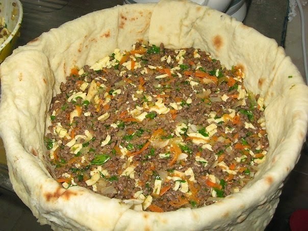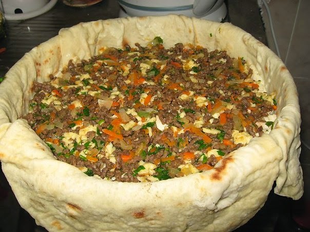 Сверху...на смятые кусочки лаваша...оставшийся фарш...