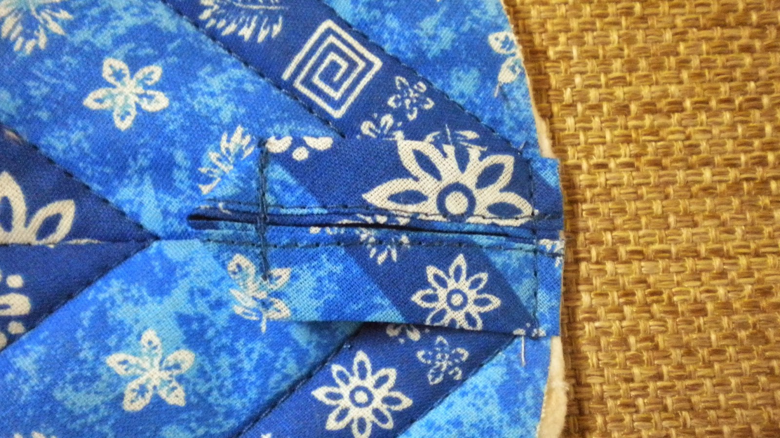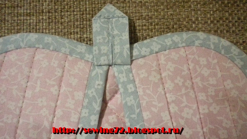 6. Настрачиваю косую бейку на верхнии части прихватки следующим образом