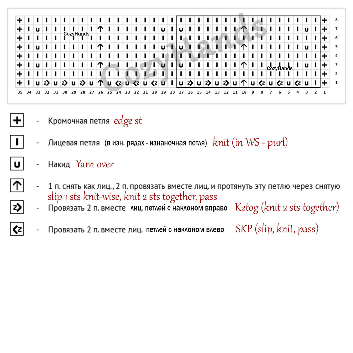1 ряд (лицевой): кром.п., *1 лиц.п., 1 накид, 2 петли провязать вместе 1 лиц.п. с наклоном влево, 1 накид, 2 петли провязать вместе 1 лиц.п. с наклоном влево, 1 накид, 2 петли провязать вместе 1 лиц.п. с наклоном влево, 1 накид, 3 петли провязать вместе 1 протяжкой (1 петлю переснять как лицевую, 2 петли провязать вместе 1 лиц.п. с наклоном вправо, протянуть ее через переснятую), 1 накид, 2 петли провязать вместе 1 лиц.п. с наклоном вправо, 1 накид, 2 петли провязать вместе 1 лиц.п. с наклоном вправо, 1 накид, 2 петли провязать вместе 1 лиц.пю с наклоном вправо, 1 накид,* 1 лиц.п., кром.п.
