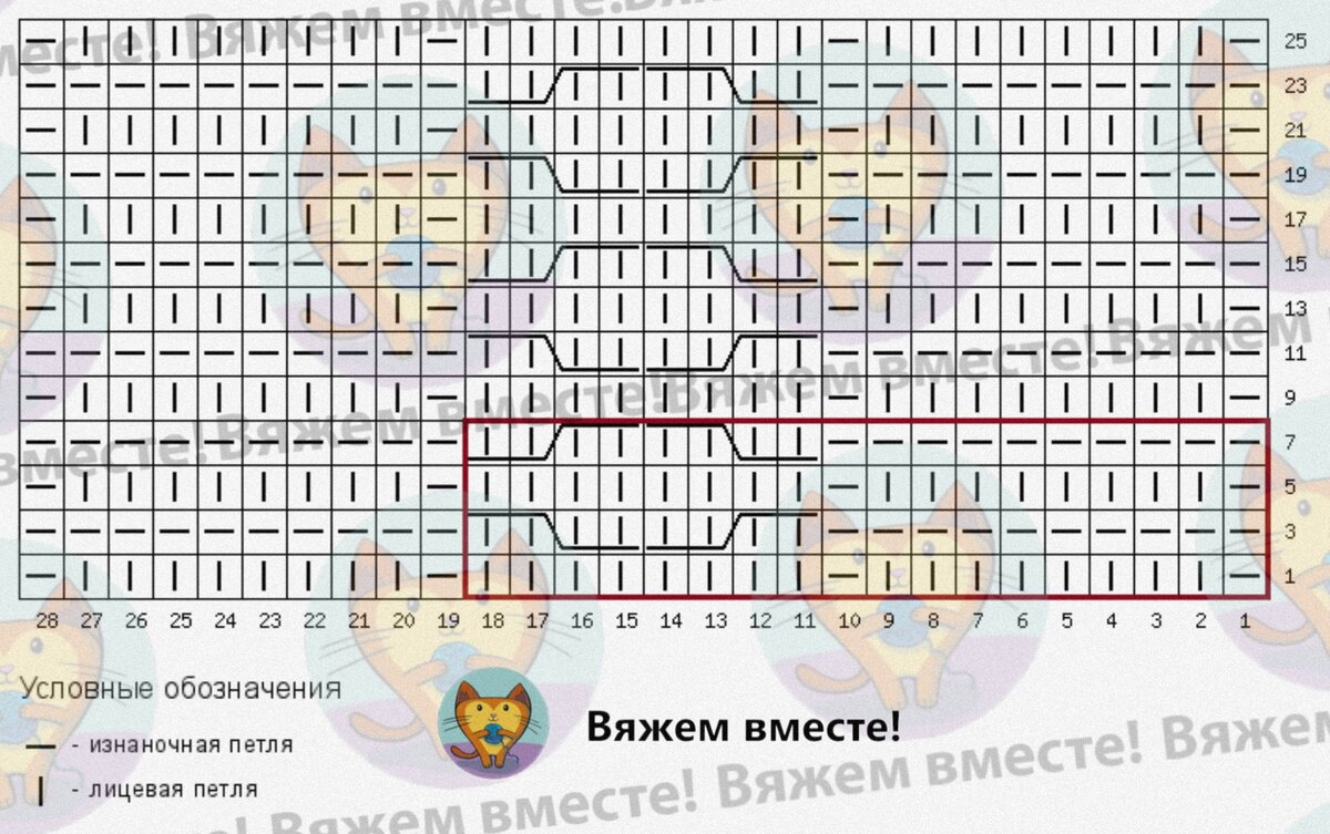 Красной рамкой на схеме выделила один раппорт, который равен 18 петлям по ширине и 8 рядам по высоте. Чётные ряды выполняются так, как петли лежат на спице.