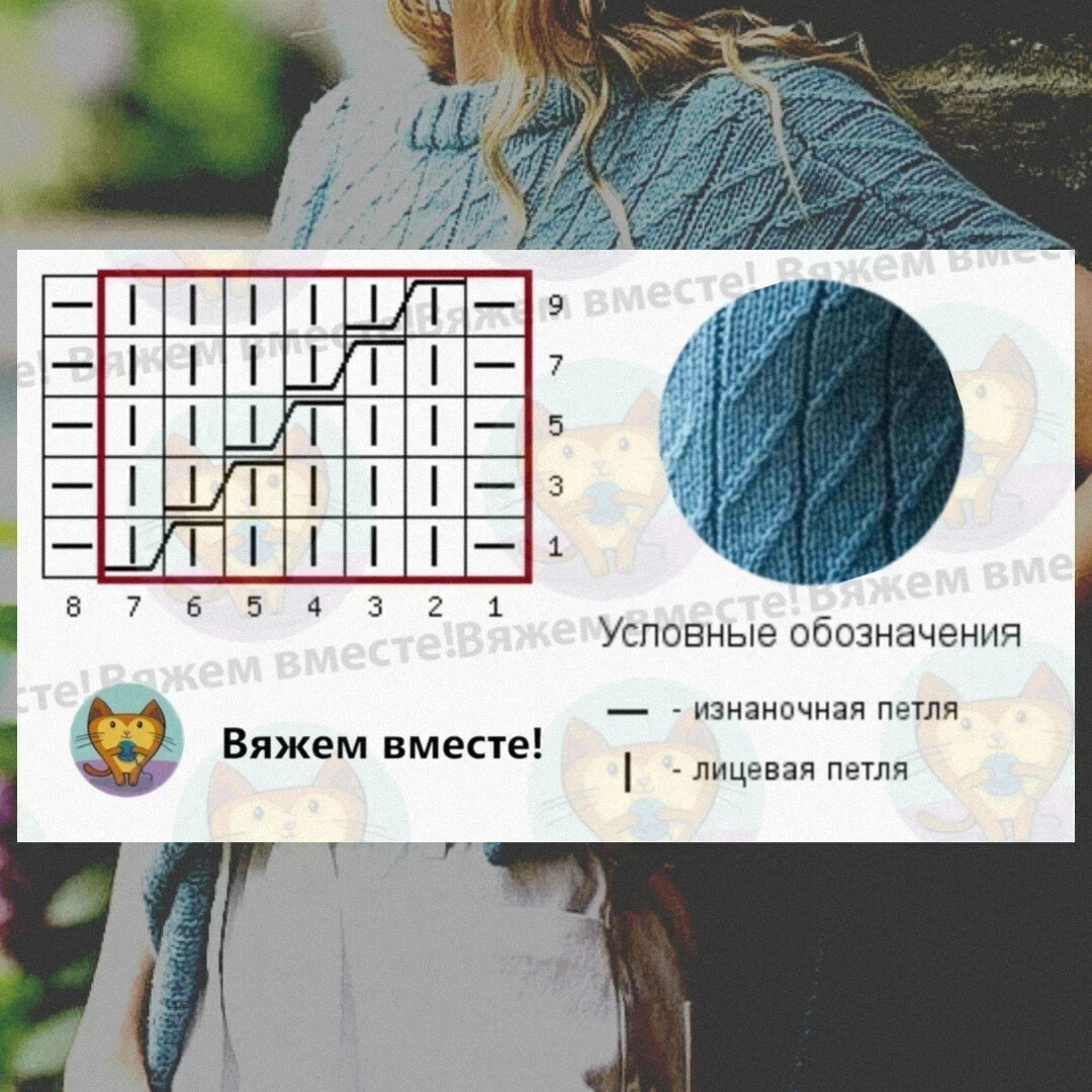 Раппорт узора равен 7 петлям по ширине и 10 рядам по высоте. Чётные ряды вяжутся по рисунку петель на спице.