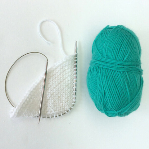 Поднимаем на спицы край основного полотна. Можно поднимать небольшой участок основы…
