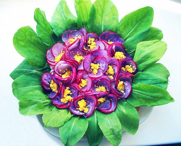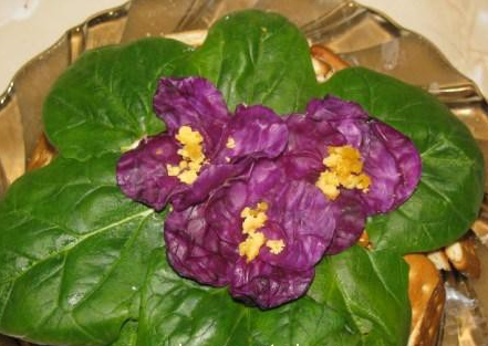 Фиалки делаем из тонких кружков редиса - покрасить их соком красной капусты, либо свеклы. Либо приготовить не из редиса, а из кружков листа красной капусты.
