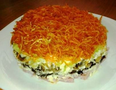 Чернослив и огурцы также соломкой, шампиньоны обжариваем с солью и перцем.