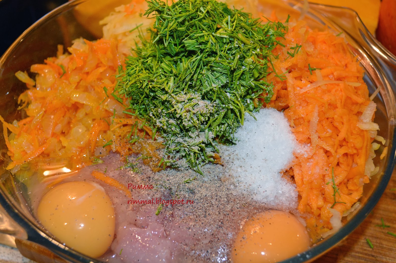 Грудку пропустите через мясорубку. Добавьте к мясу обжаренные морковь и лук, натертые кабачок и тыкву, рубленую зелень, яйца, соль, перец.