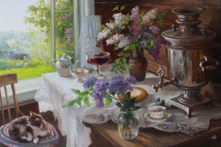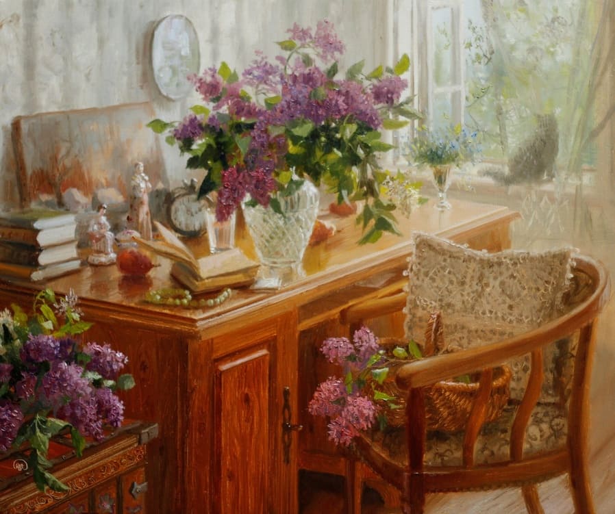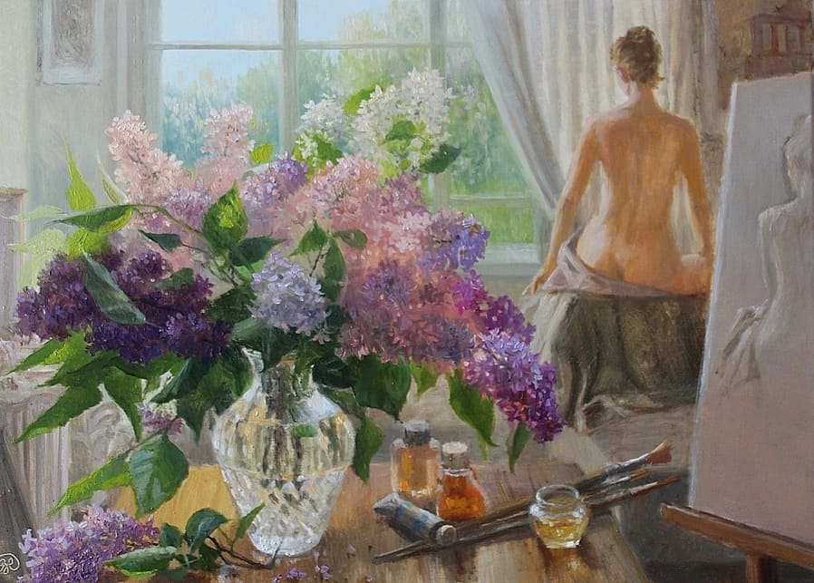 Тема творчества: сибирский пейзаж, образы старинных русских городов и царских резиденций, натюрморт, женский и детский портрет, обнаженная модель.