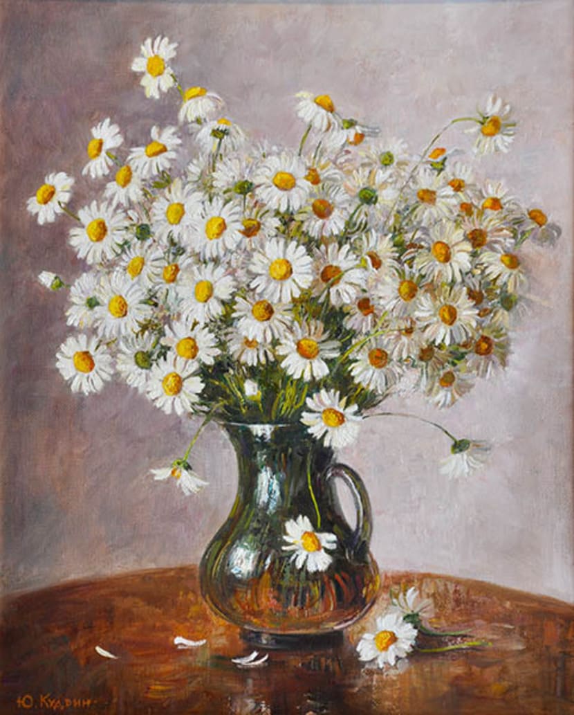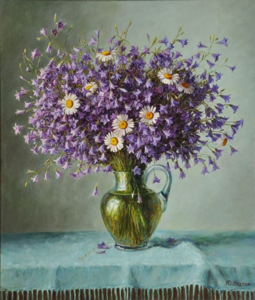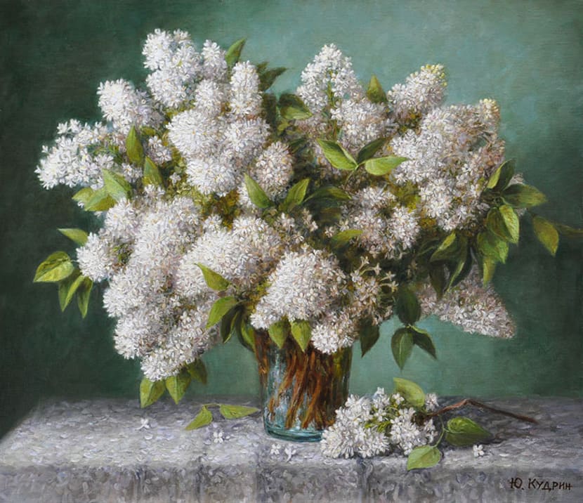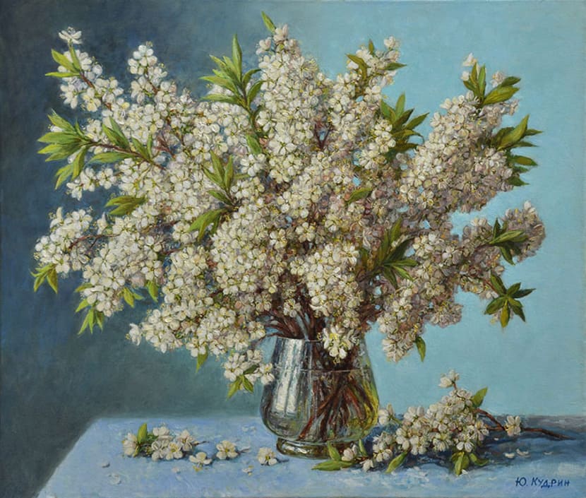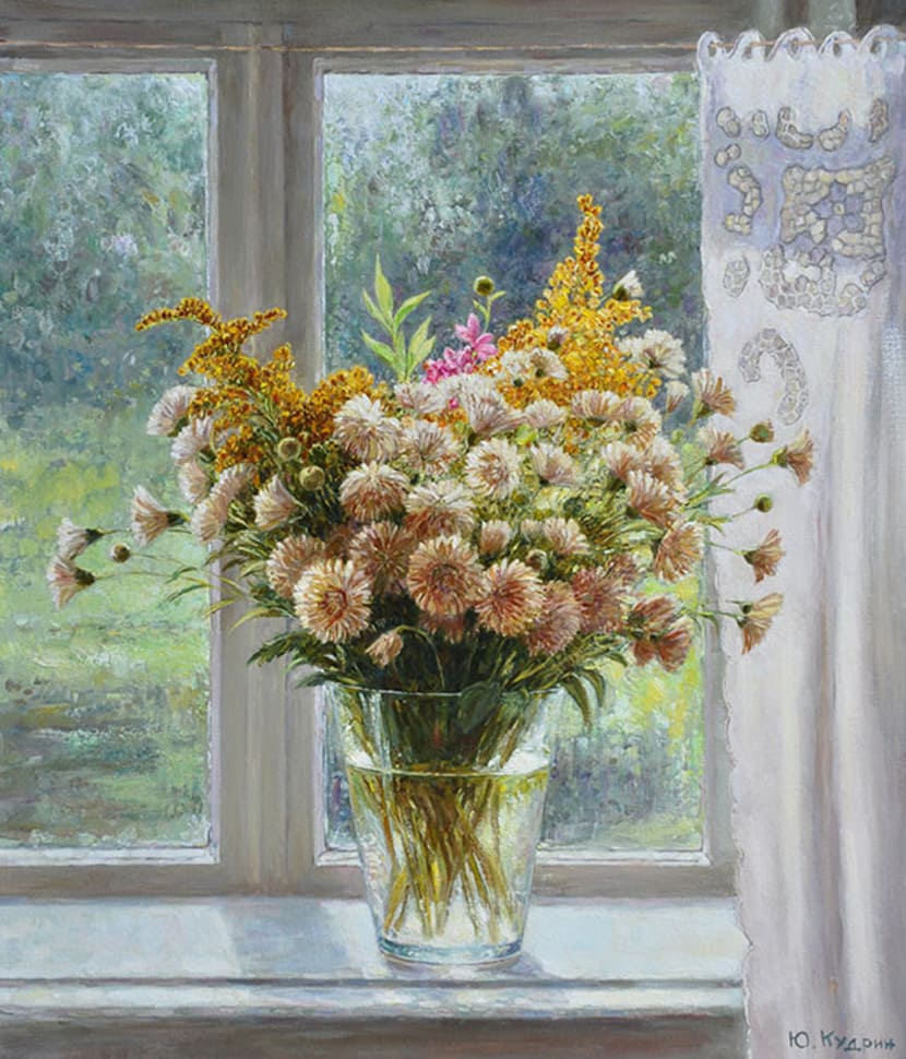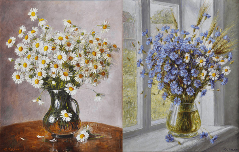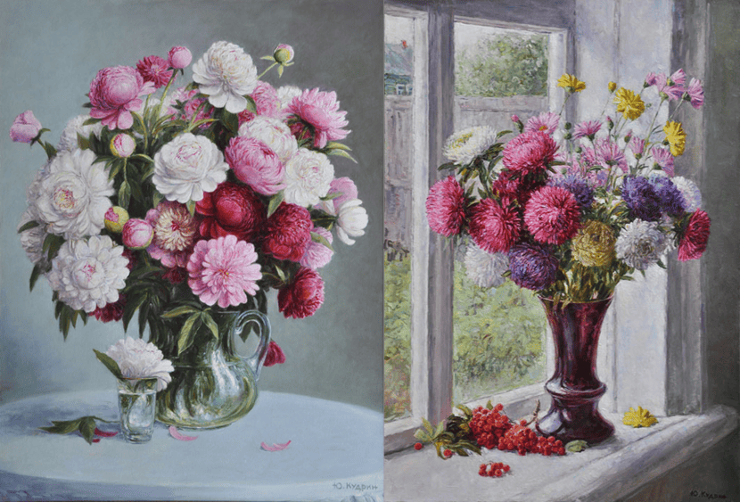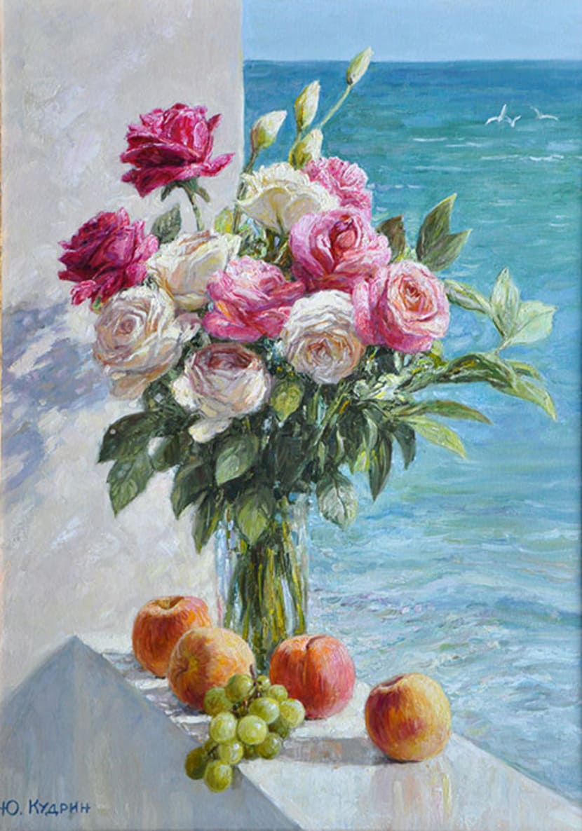 Юрий Кудрин – признанный мастер натюрморта. Работы этого жанра отличает тонкая проработка деталей, до мелочей продуманная композиция, богатство цвета и живописной фактуры. Картины с букетами цветов выделяются изяществом и сложностью рисунка. Часто цветы изображены на ровном спокойном фоне, который позволяет сосредоточить взгляд зрителя на главном, и делает картину удивительно цельной.