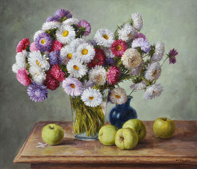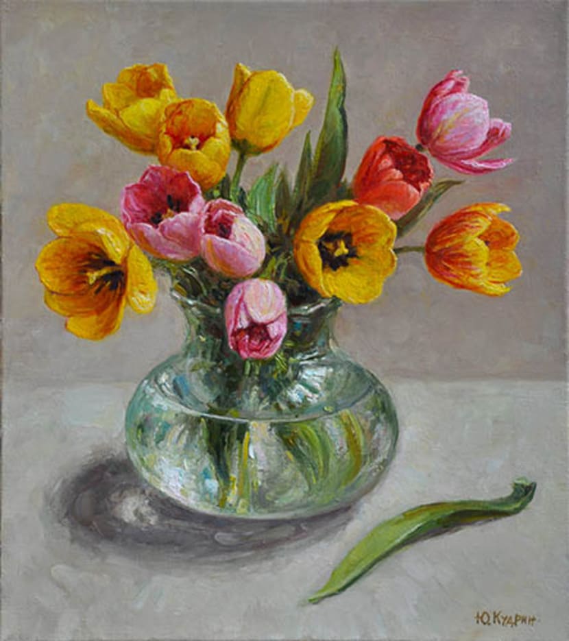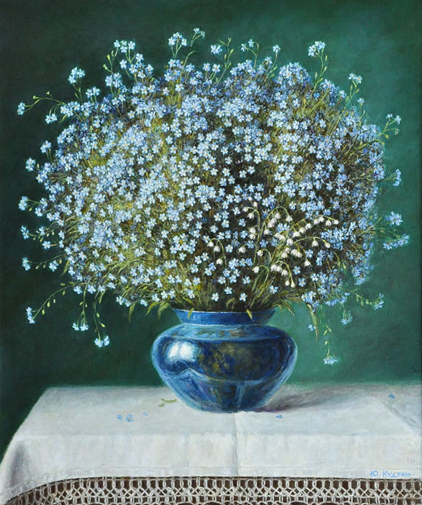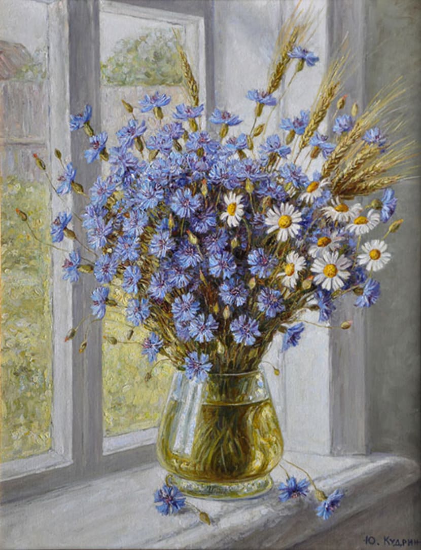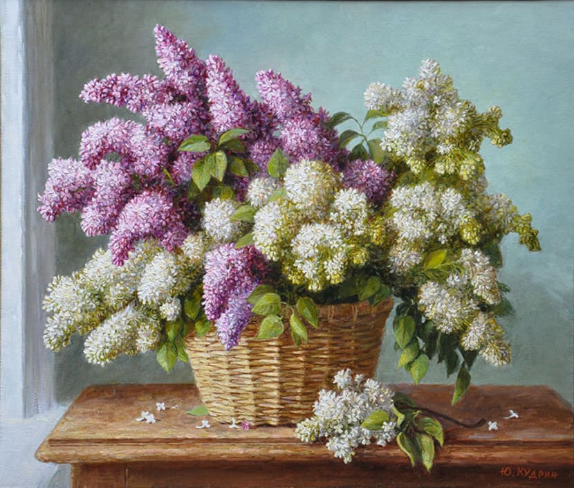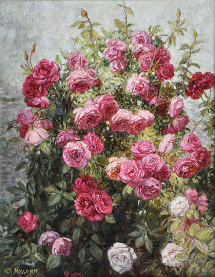 Юрий Кудрин – признанный мастер натюрморта. Работы этого жанра отличает тонкая проработка деталей, до мелочей продуманная композиция, богатство цвета и живописной фактуры. Картины с букетами цветов выделяются изяществом и сложностью рисунка. Часто цветы изображены на ровном спокойном фоне, который позволяет сосредоточить взгляд зрителя на главном, и делает картину удивительно цельной.