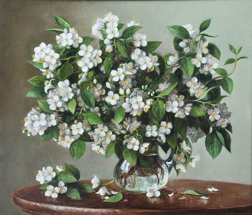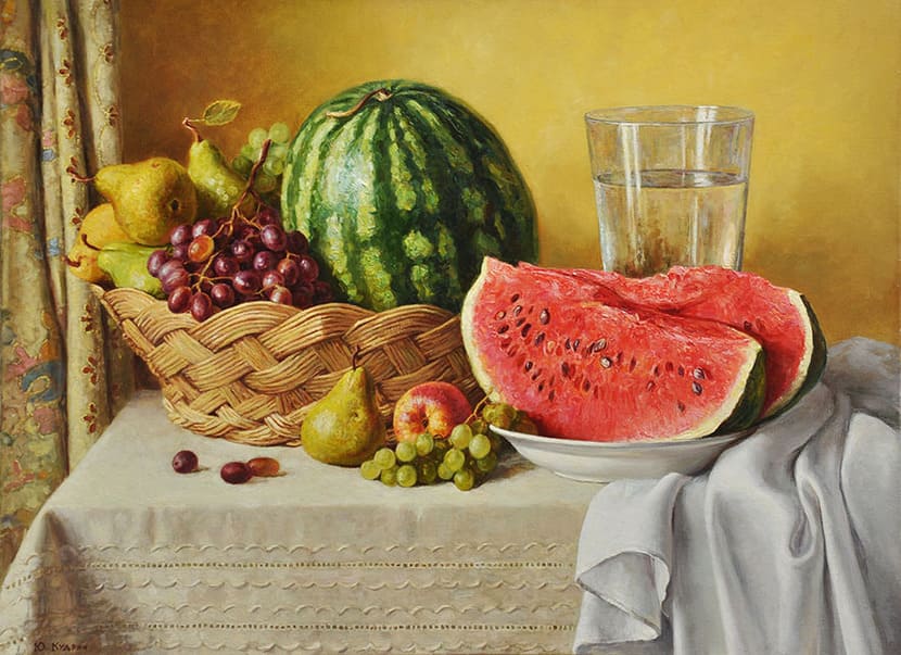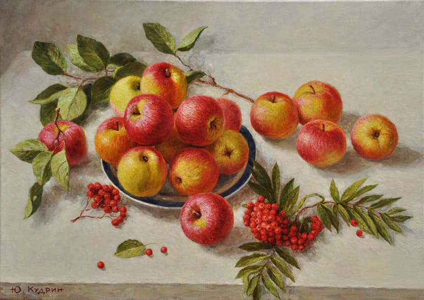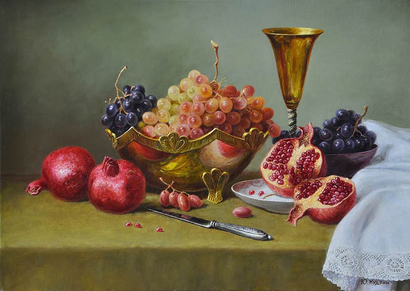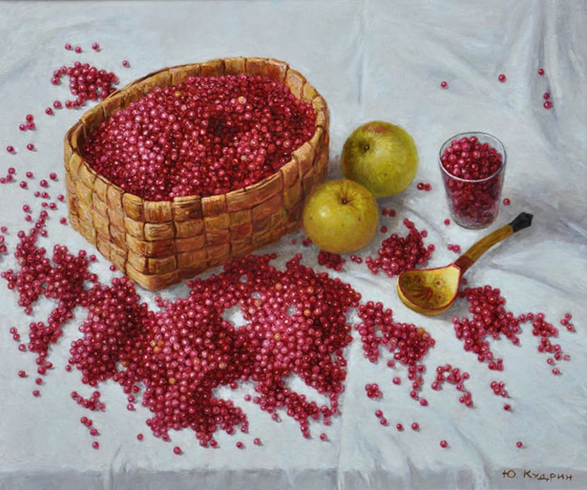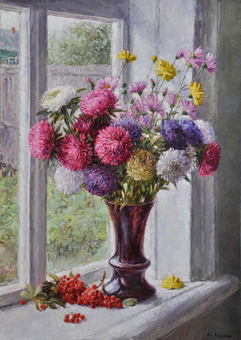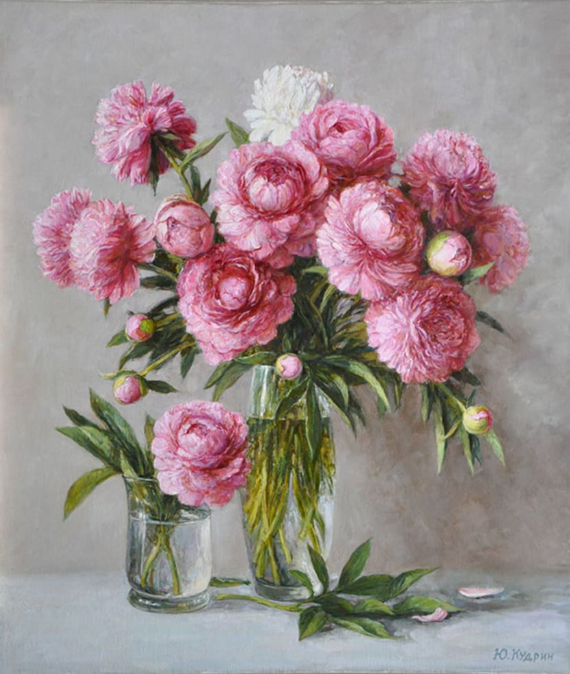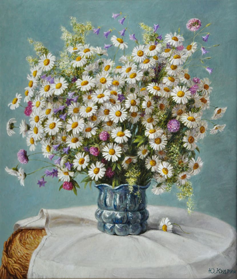 Юрий Кудрин – признанный мастер натюрморта. Работы этого жанра отличает тонкая проработка деталей, до мелочей продуманная композиция, богатство цвета и живописной фактуры. Картины с букетами цветов выделяются изяществом и сложностью рисунка. Часто цветы изображены на ровном спокойном фоне, который позволяет сосредоточить взгляд зрителя на главном, и делает картину удивительно цельной.