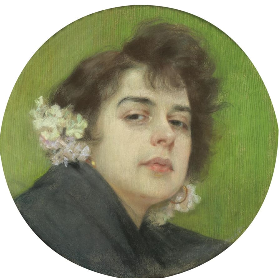 Портрет темноволосой женщины с цветами в волосах на зеленом фоне, 1897 г.