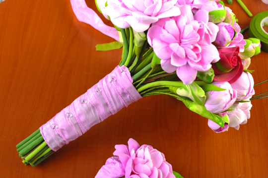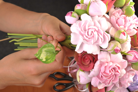 3. Для букета флористическую проволоку можно не обматывать тейп-лентой, так как стебли будут практически не видны. Соберите букет из нескольких цветов, которые примотайте тейп-лентой. В самом конце добавьте листья.