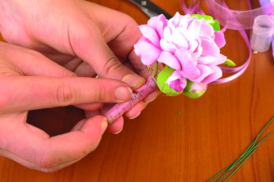 1. Все проволочные части бутоньерки (2 листа, 1 цветок, 3 бутона) обмотайте флористической тейп-лентой. С помощью ленты соедините все заготовки вместе, присоединяя детали по одной. Длину стеблей оставьте 7-8 см, лишнее отрежьте кусачками.