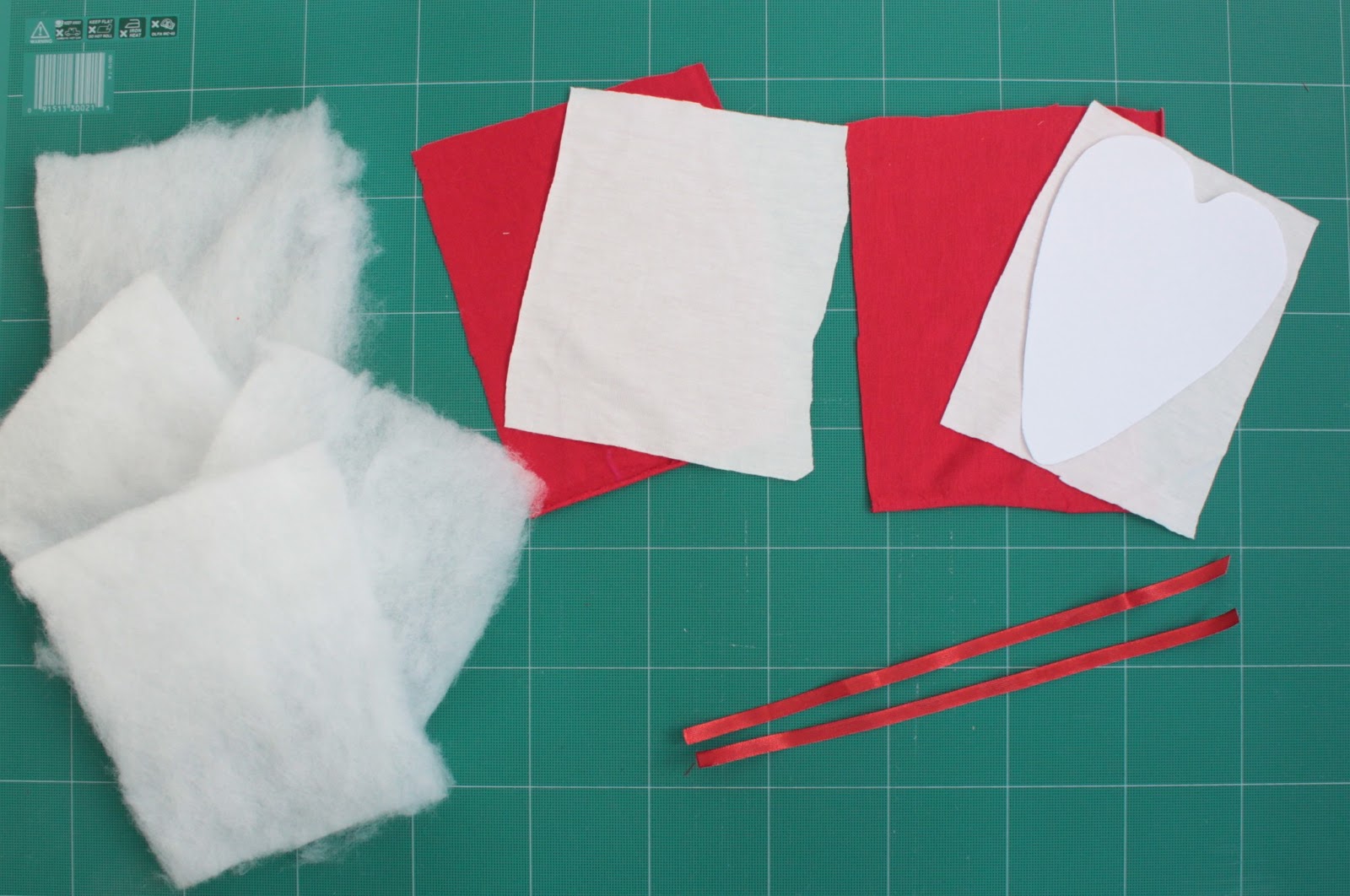 Вырезаем для одного сердечка - 2 квадрата ткани по размеру сердечка - у меня это трикотаж белого и красного цвета. И 2 таки же квадрата синтепона, ленточку-подвеску.