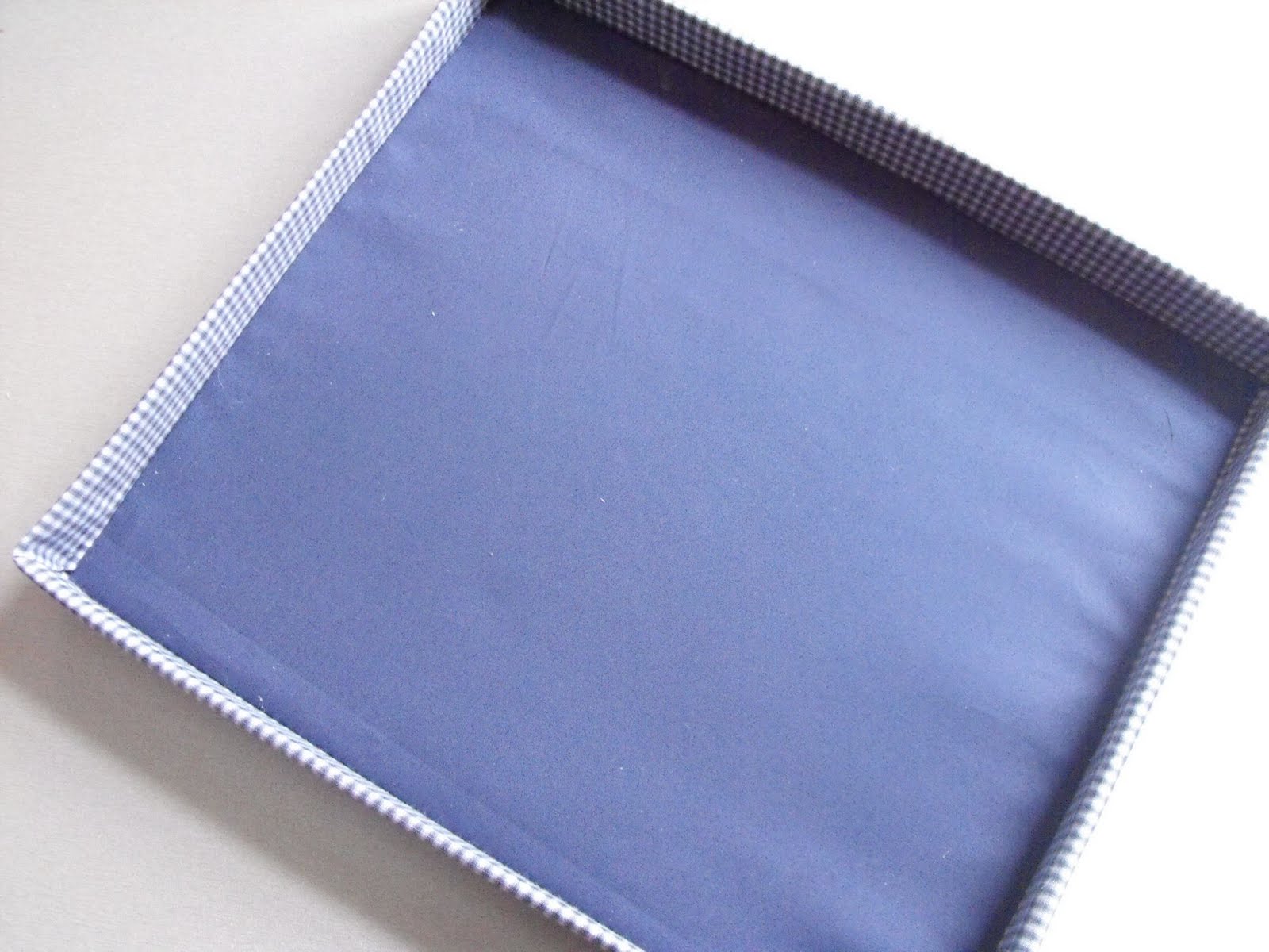 4. Обернув подкладочную ткань по периметру крышки, боковые стороны сшить. Выступающие края ткани сверху приклеить к верху крышки, выступающие края ткани снизу заправить внутрь и, выравнив углы, приклеить к внутренней стороне крышки.
