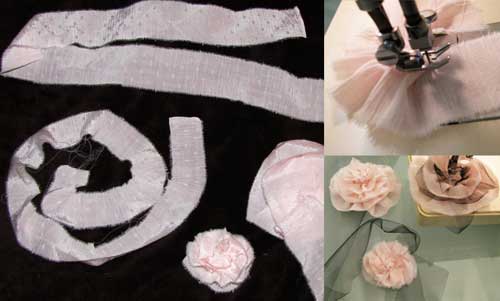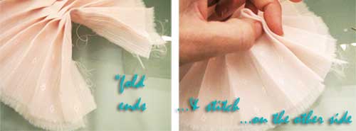 Из второй полоски 6" сделайте цветок: сложите ее, прошейте сборкой, скрепите.