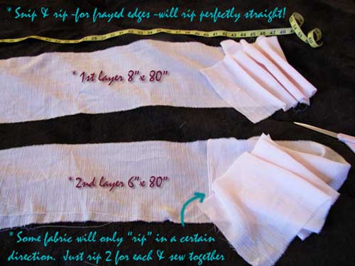 Из ткани вырежьте три полоски: одну 8"x80" и две 6"x80". 1 дюйм=2.54 см