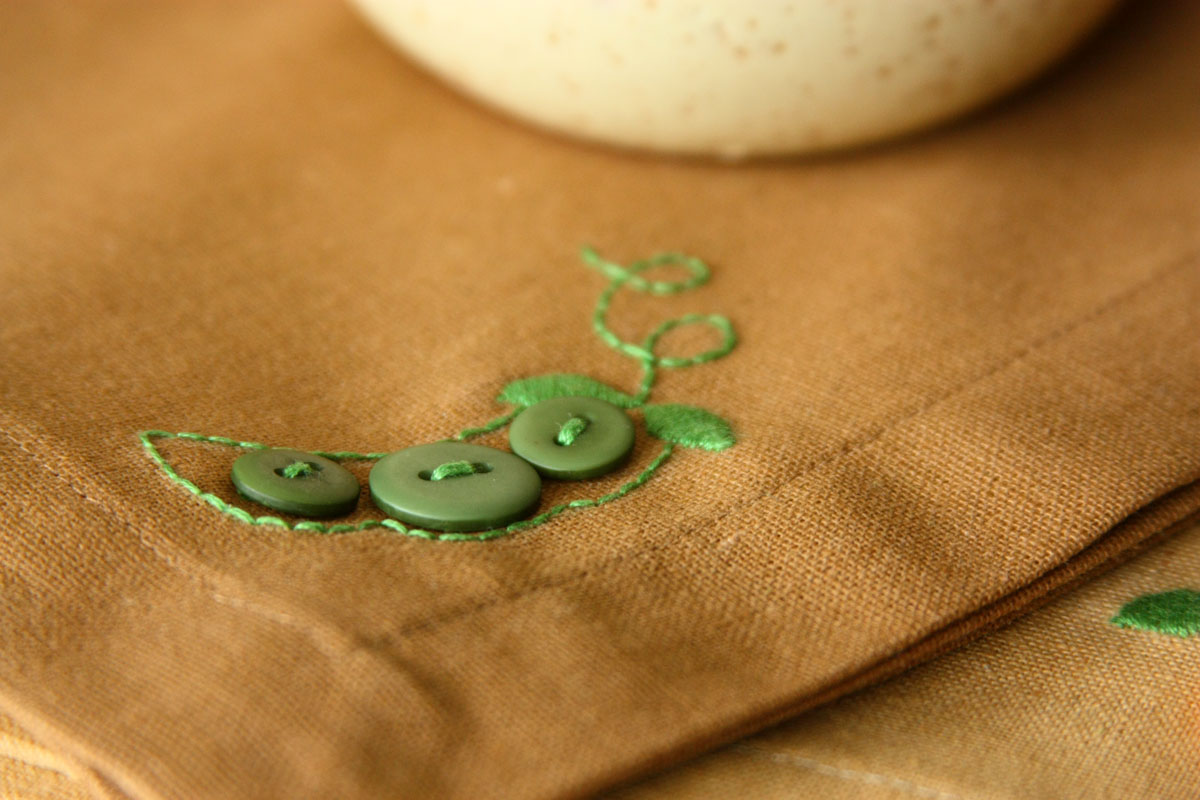 Пришиваем пуговицу, делаем хвостик швом "назад иголка" и листик "гладью" - получаем апельсин. Либо делаем небольшой эскиз на бумаге в виде стручка гороха (предварительно разложив на листе пуговицы для определения размера стручка), и вуа-ля: