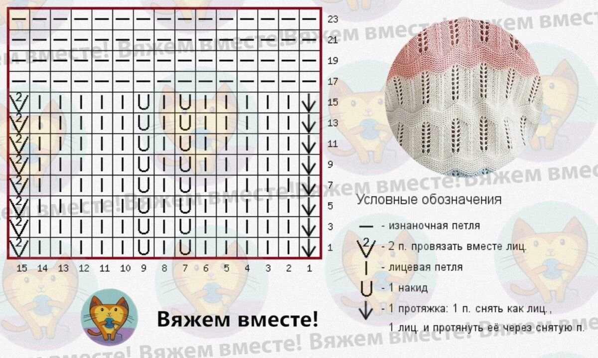 Раппорт узора составляет 15 петли по ширине и 24 ряда по высоте. (Смена цвета происходит через каждые 48 рядов). Чётные ряды, которые не даны на схеме, следует вязать так, как лежат петли на спице.