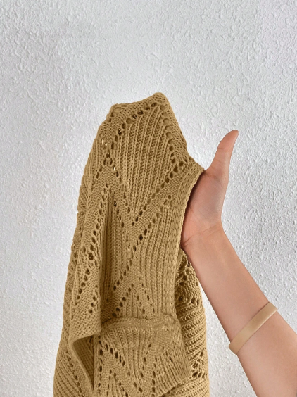 Планка пройм выполнена также резинкой 1 х 1 одним полотном вместе с передом/спинкой, но лицевые петли резинки с каждой стороны полотна провязаны, а изнаночные сняты и перенесены на правую спицу — приём, который укрепляет резинку, не даёт ей вытягиваться вертикально.