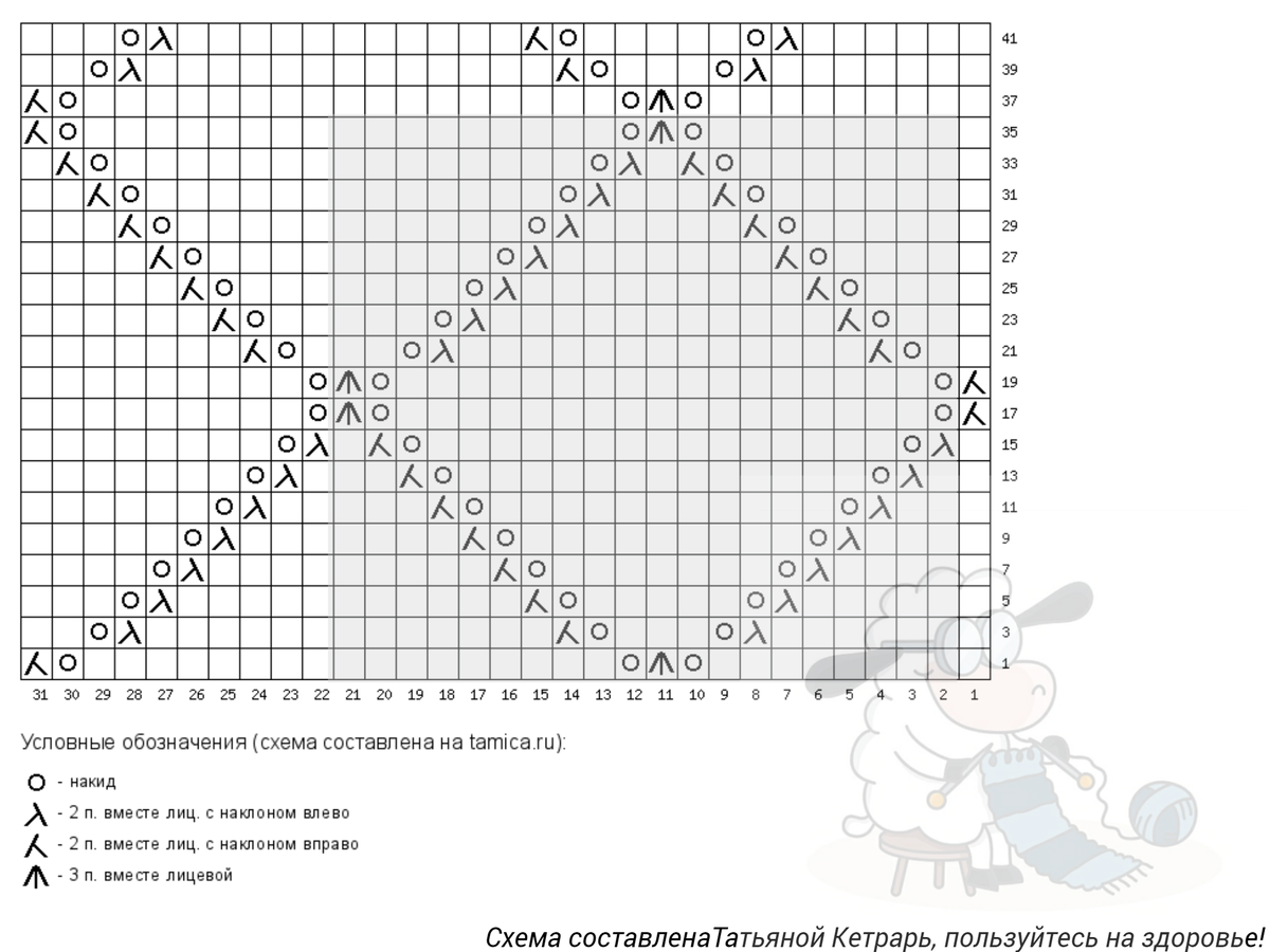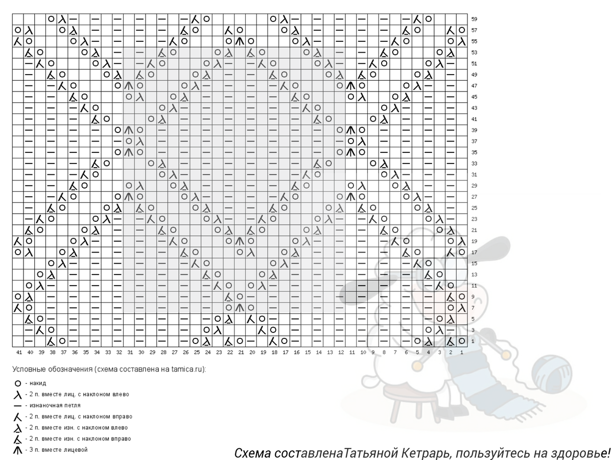 Схема составлена для чётных рядов узора, в нечётных рядах все петли вяжутся по рисунку. Раппорт = 20 петель и 48 рядов (выделен серым). в начале ряда вязать петли с 1-й по 11-ю, затем повторять раппорт нужное для вашего размера количество раз, закончить ряд петлями с 32-й по 41-ю.