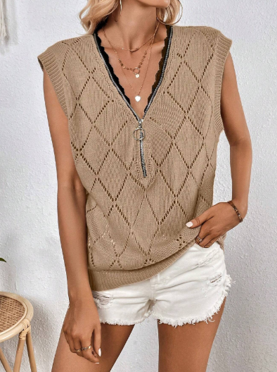 Край V-образного выреза оформлен пришивным чёрным кружевом, которое оттеняет замок-"молнию" и, возможно, не даёт ей царапать кожу шеи.