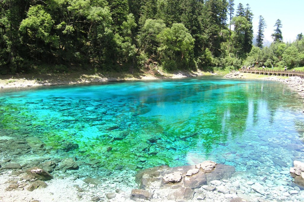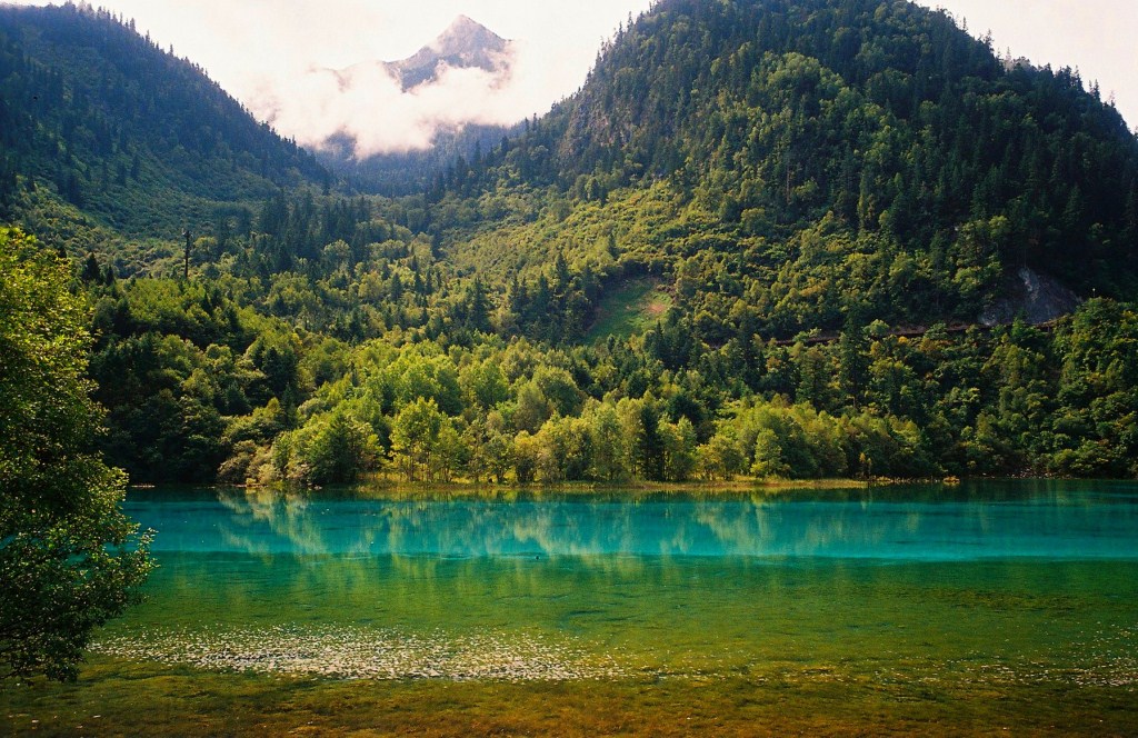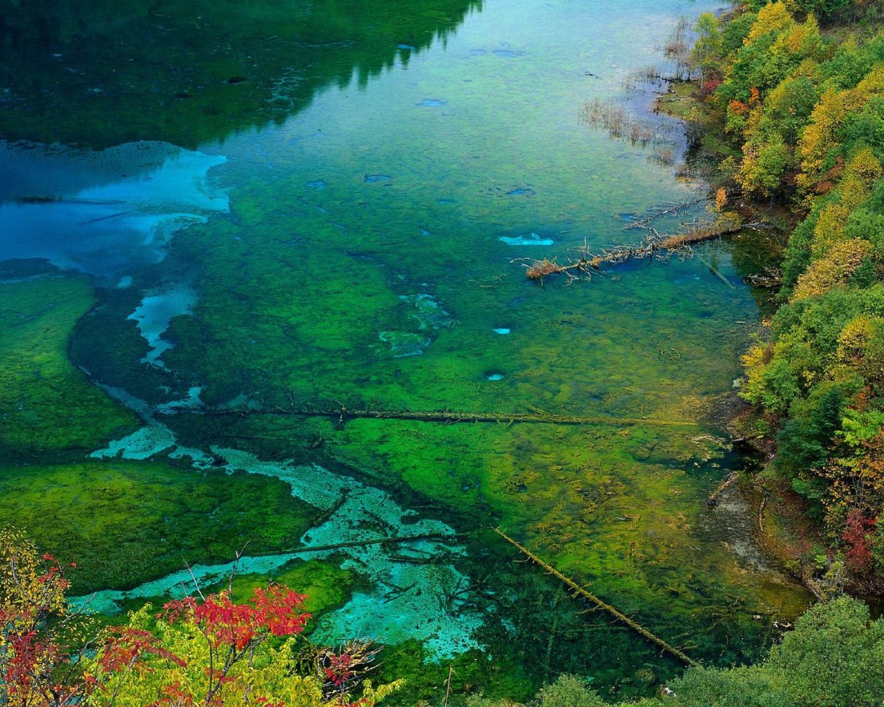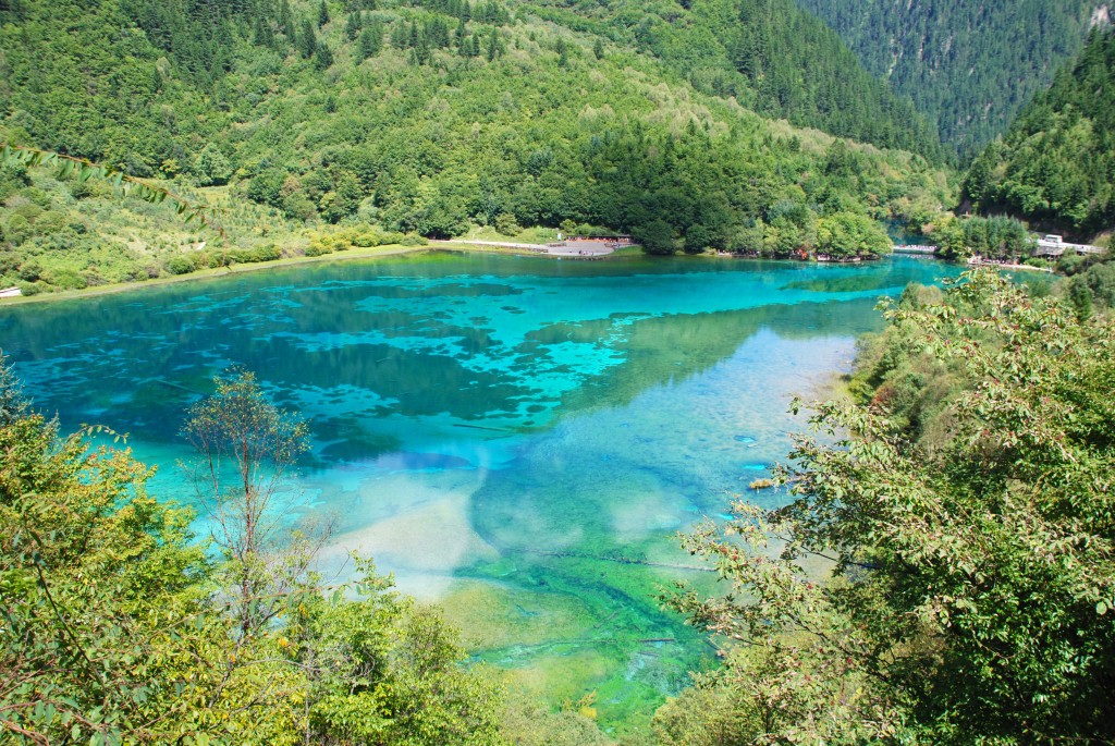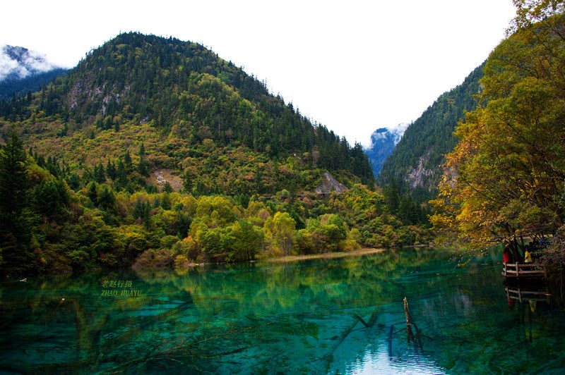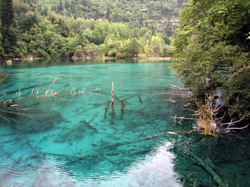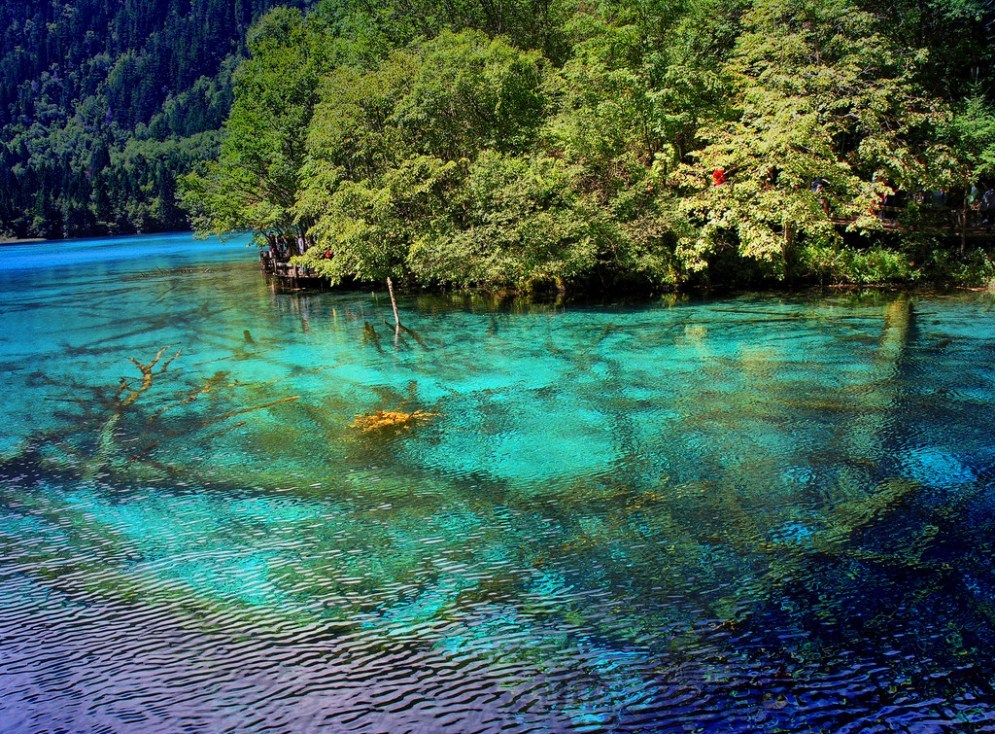Ухуа Хай или Озеро Пяти Цветов в долине Цзючжайгоу, Китай – мелкое озеро, наполненное реликтовыми упавшими деревьями, виднеющимися сквозь кристально чистые воды. Многоцветность озера возникла из-за реакции лежащих в озере деревьев на определённые минералы. Название – Озеро Пяти Цветов – произошло из-за того, что в любое время года в озере присутствуют как минимум 5 различных цветов. Эту жемчужину Цзючжайгоу также называют Озеро Павлина.